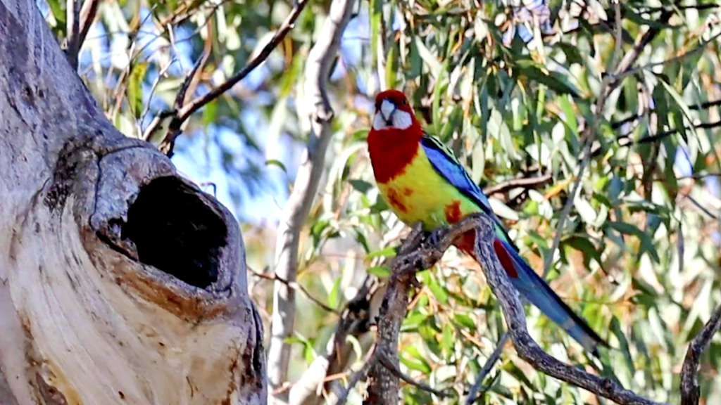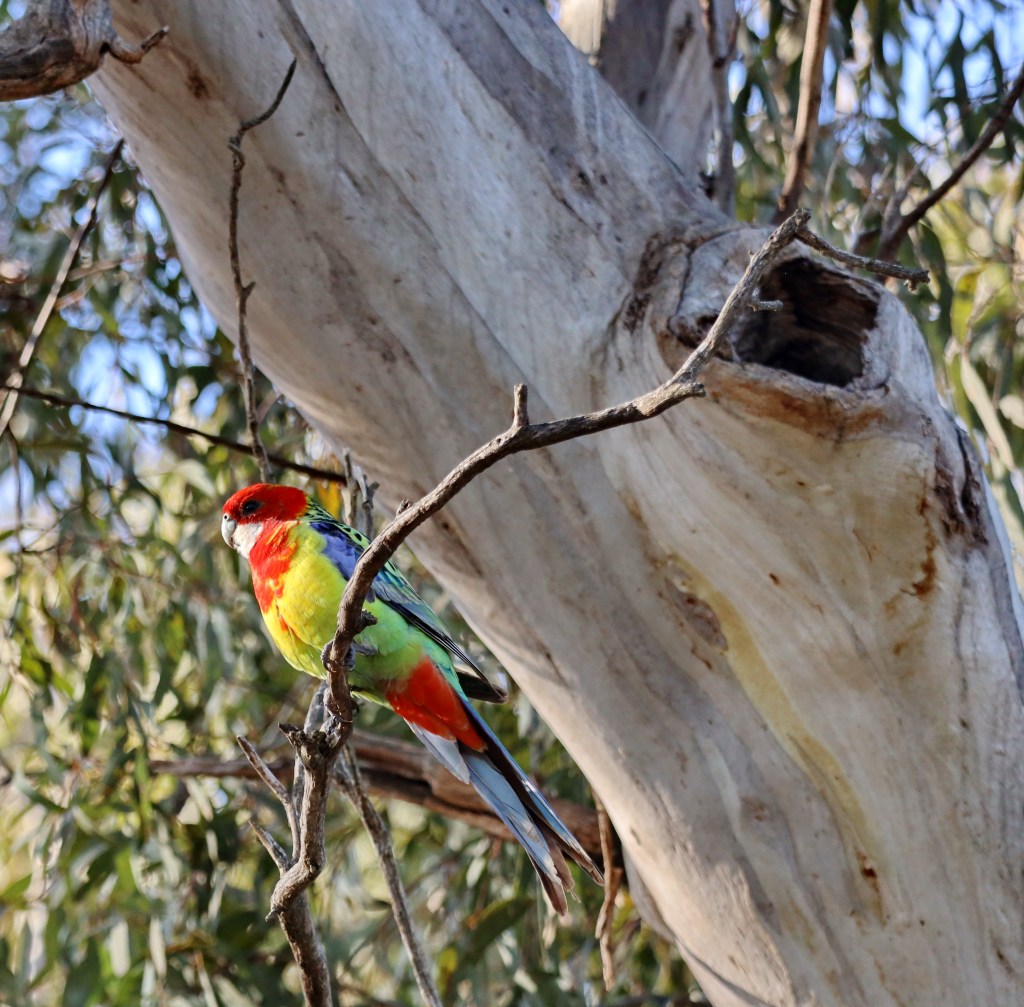 Yes Spring has cycled around again and lots of courting, mating and nest construction is under way in our part of the world, as the most industrious productive time of year for many birds, particularly the passerines gets underway. However, let it be known that many Australian birds nest in the colder Winter months also, for example the Superb Lyrebird. While we were in Wagga Wagga again by Lake Albert we sighted a pair of Eastern Rosella checking and guarding their next in a River Gum by the lake. These extremely human shy birds usually fly off on our approach, but because they are nesting they are captive to the hole on the tree. Parrots, similar to owls, Kookaburras and Kingfishers choose to nest in tree holes.