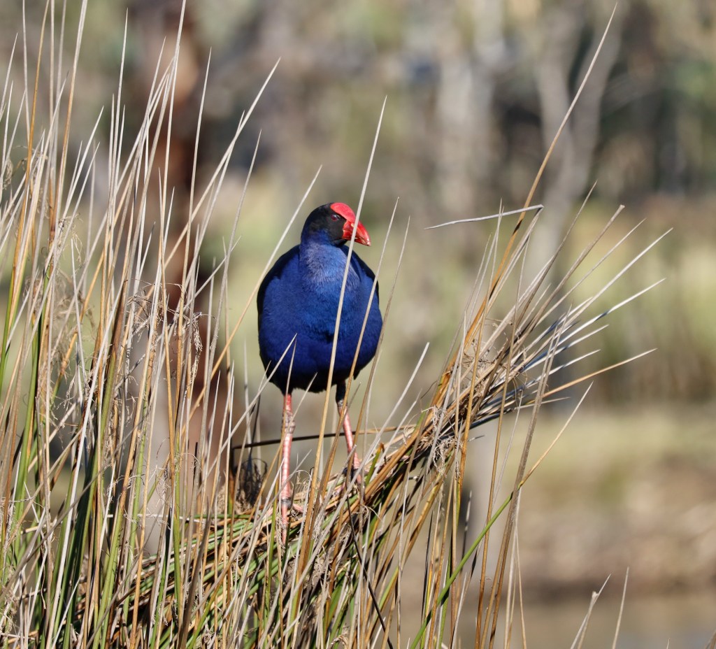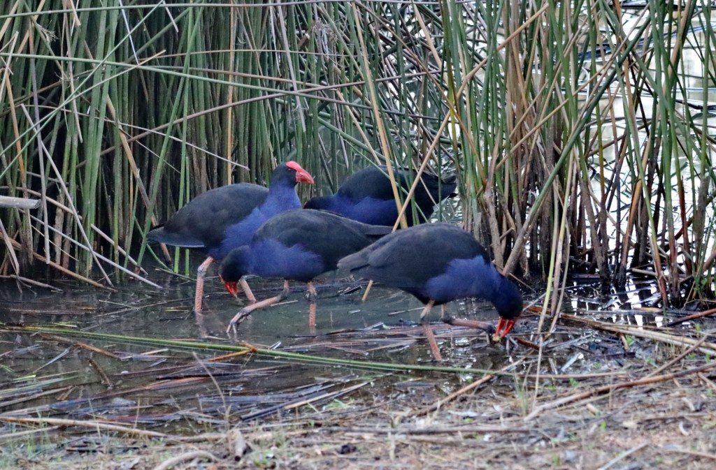 Australasian Swamphen previously the Purple Swamphen are feeding by the waters edge, as one keeps lookout on top of the reeds.