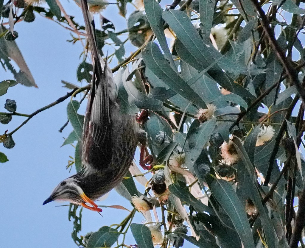 Other endemic honeyeaters we saw at Inala Nature Reserve were the Black-headed Honeyeater and the Strong-billed Honeyeater. They were busy among the White and Blue Gum trees after nectar, lerps, insects and manna, which the Pardalotes had made available to them also, though the Strong-billed Honeyeater looked like some nest building was taking place.