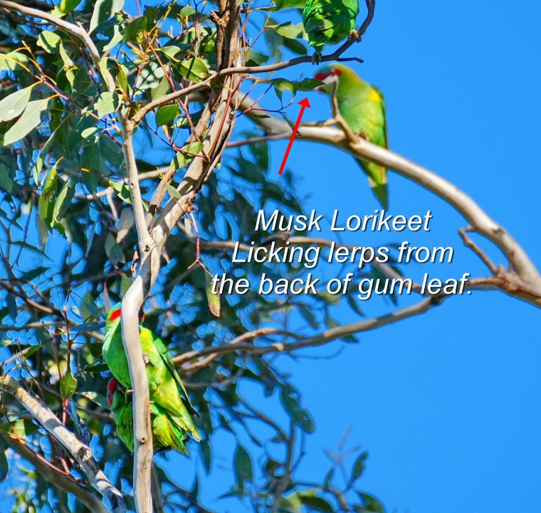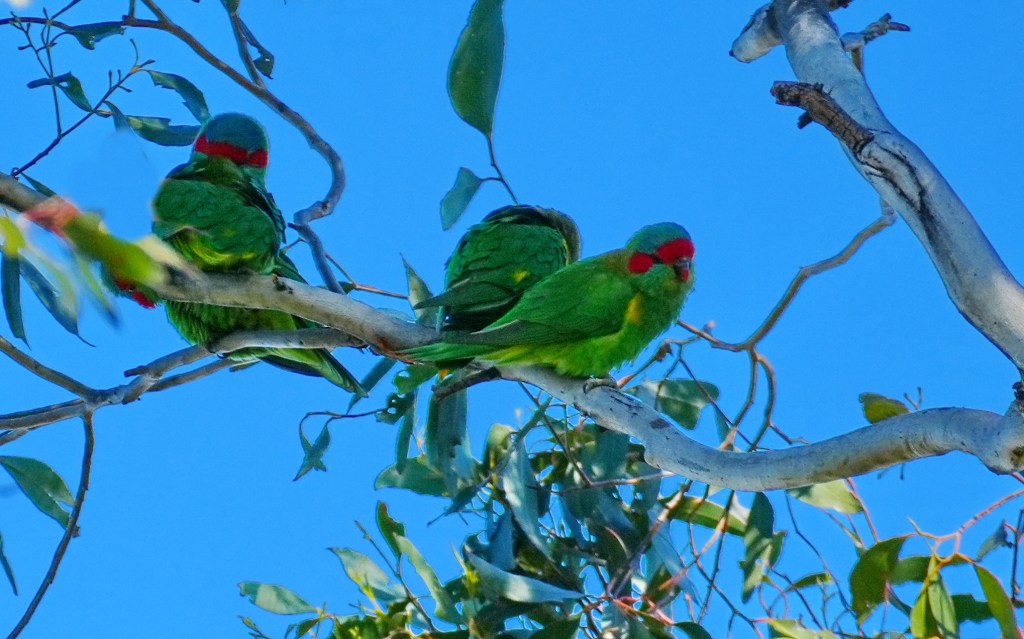 The Musk Lorikeet were resting, preening and assisting to remove bugs and lice from their lifelong partners. Like most birds of the parrot family they form a life long bond causing them to pair for life. These nomadic birds feed on eucalypt blossom and nectar using their brush-tipped tongues to flick it into their mouths. They also enjoy lerps, insects and native berries and fruits. The Musk Lorikeet gets its name from the musky floral sweet scent it emits.