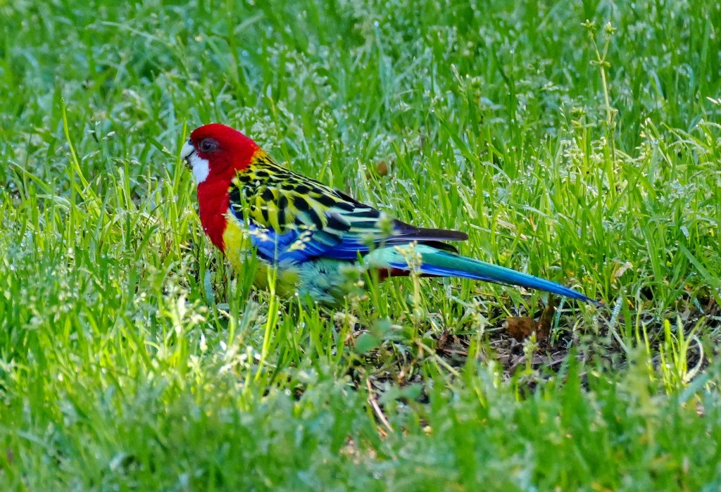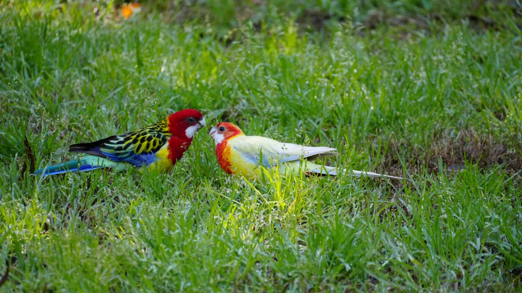 I decided for a change to walk in another park nearby which I rarely visit where I was rewarded with a small flock of Eastern Rosella, a beautiful bird from the Parrot family which is very shy of humans, and which we usually only see in our area this time of year feeding on grass seed. The wonder of this moment was to see a parent teaching its juvenile to feed as the two quietly fed away from the flock. Thankfully, as I kept my distance they did not fly off. It was a such a privileged blessing I was gifted to experience these mindful moments watching these birds. Here we see the love of the parent to its child, the sharing of food, and the parent proudly observing the youngster feeding by itself.