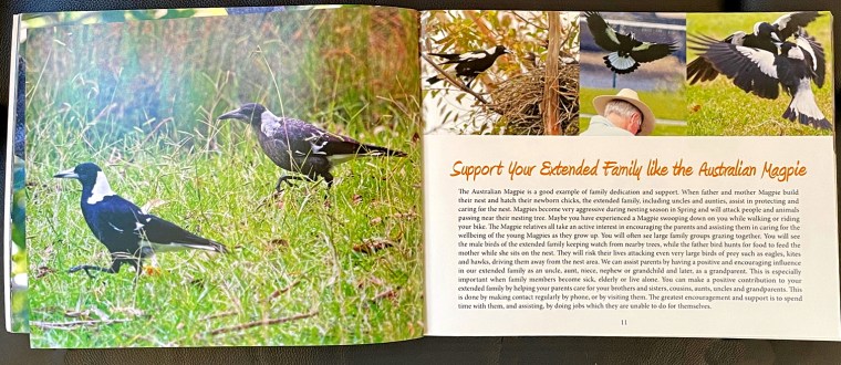 The intelligent Australian Magpie and its very human like behavioural characteristics is featured in my book What Birds Teach Us, which can be purchased securely online, posted to your address. With Christmas coming, this book will make a wonderful addition to your child’s learning and reading. Not only will it introduce them to our beautiful and interesting Australian birds, it has the added bonus of each bird teaching a helpful life skill or lesson that will assist them to make wise life choices for a happy and healthy life. This book has become a very popular gift idea for Primary school aged children as it addresses important issues which help them to better navigate their their life journey. It has a reading age of 8 years to adult. Many adults enjoy it, and has proved to be a wonderful gift for overseas friends and family. Click on the image below to find out more. The page will open on a new tab.