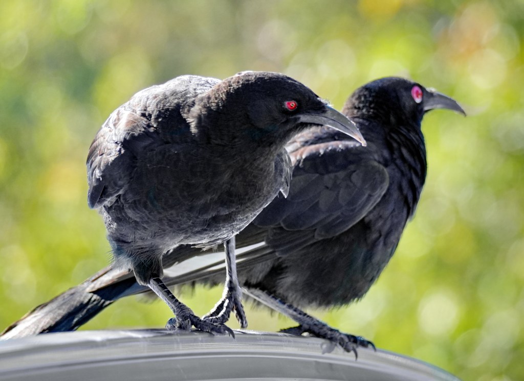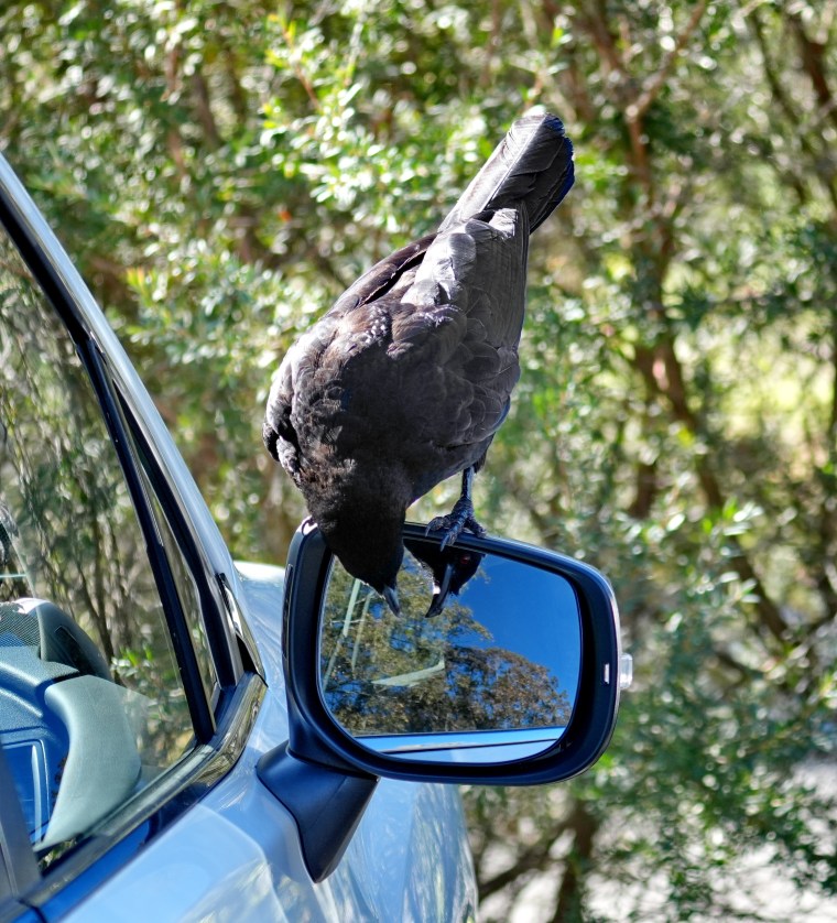 In a similar way and with similar and repeated persistence, even when we tried to drive them off, this pair of White-winged Chough would continue to move from parked car to parked car peering and pecking at their reflected images. If you look at the second bird on the first image above you can see the edge of the white underwing which is predominant contrast to the black when they fly.