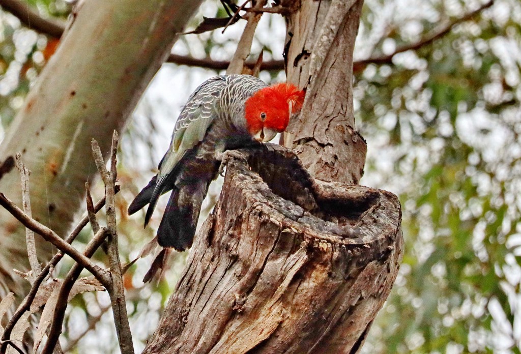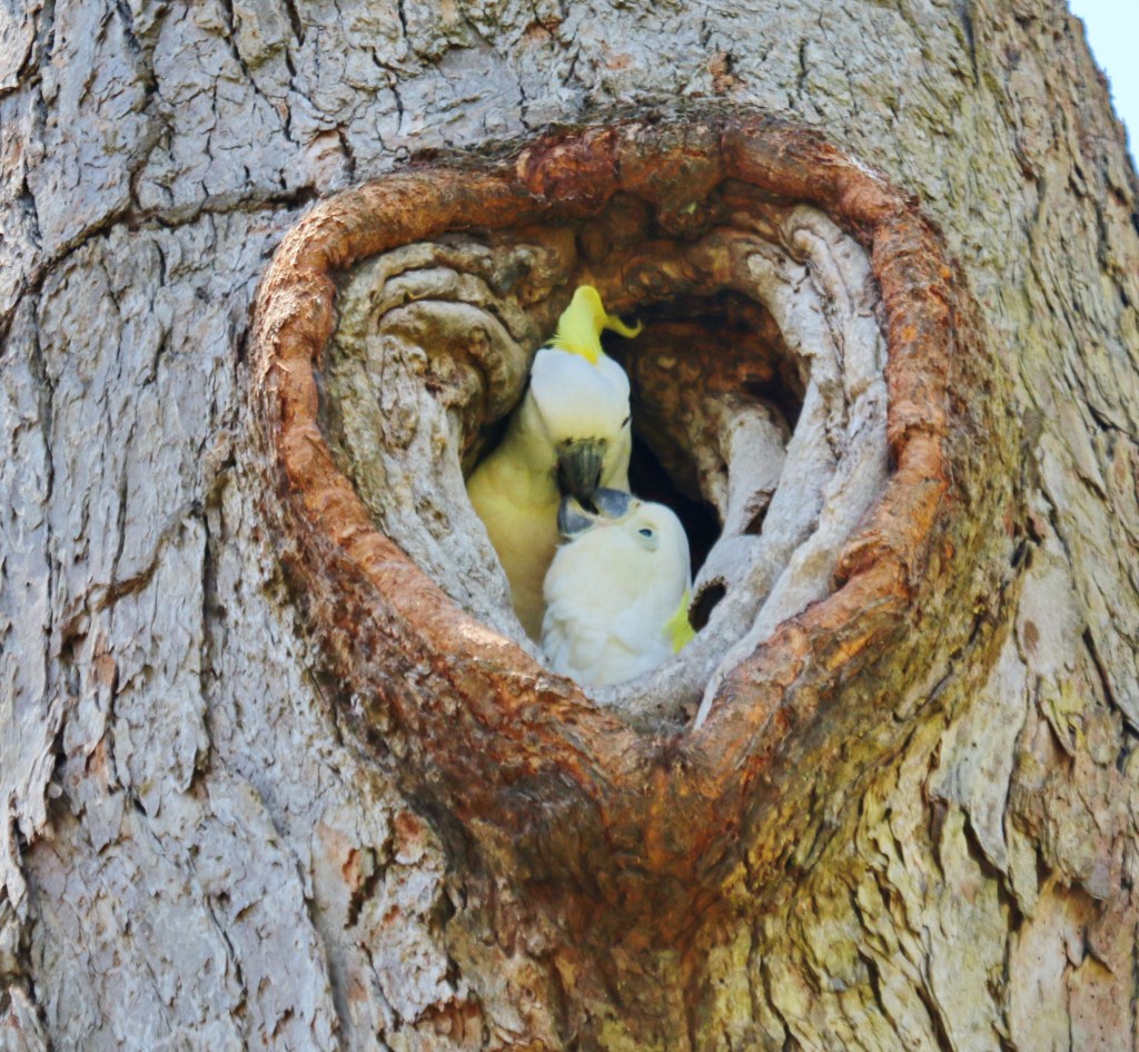A common form of nesting is the tree nesting hole, which is only possible in very old forest trees, which are being logged constantly and causing many species to delay breeding. The holes for natural protection for many species including the Parrot/ Cockatoo family, Owls, Kingfisher and Wood Ducks. The Sulphur-crested Cockatoo will find a hole and using its strong beak, will chick out the remainder of the tree hole to enlarge it for the family. Here is an example of a male Cockatoo chipping out the nest while his female watches on.