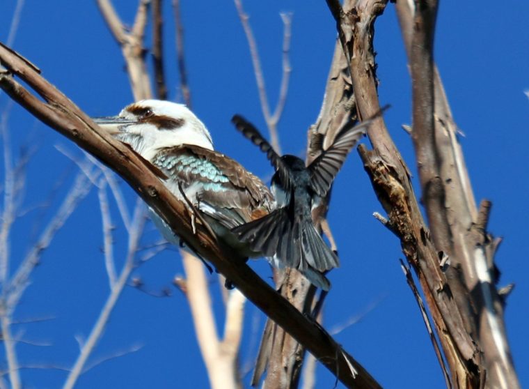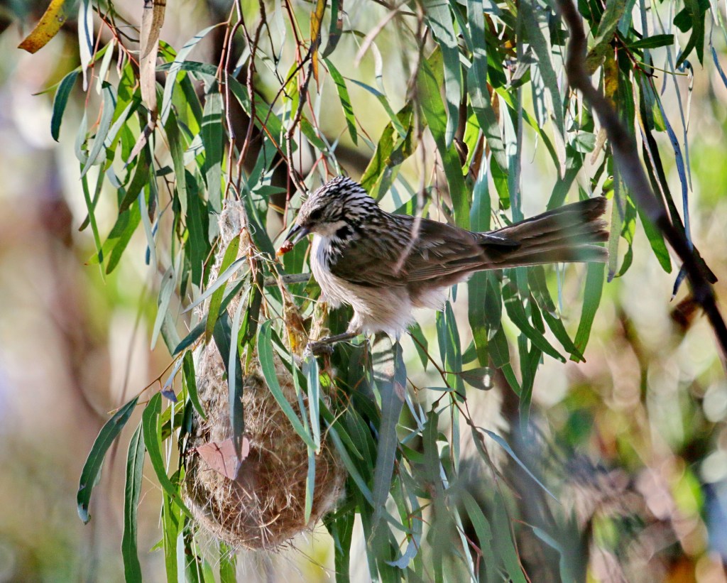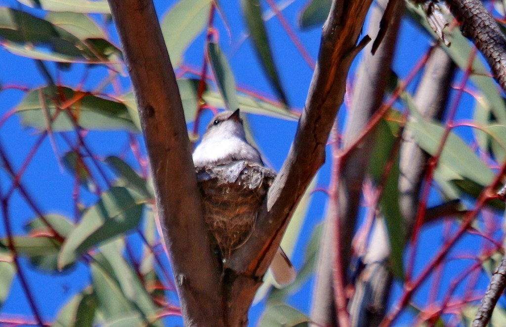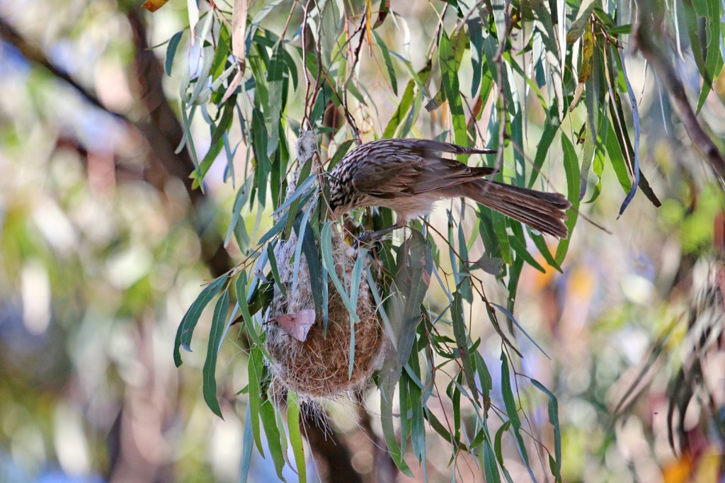 In my feature photo the Willy Wagtail (a fantail flycatcher) has a bowl nest securely covered in spider’s web, able to hide the nestlings well. It has placed the nest in a sheltered area. They have a high success rate and become quite brave, bold and aggressive during nesting season, driving off much larger nestling predators such as Laughing Kookaburras. Have you ever thought how difficult it must be to form a perfectly round nest with just a beak, collecting and sealing it with spider’s web ?