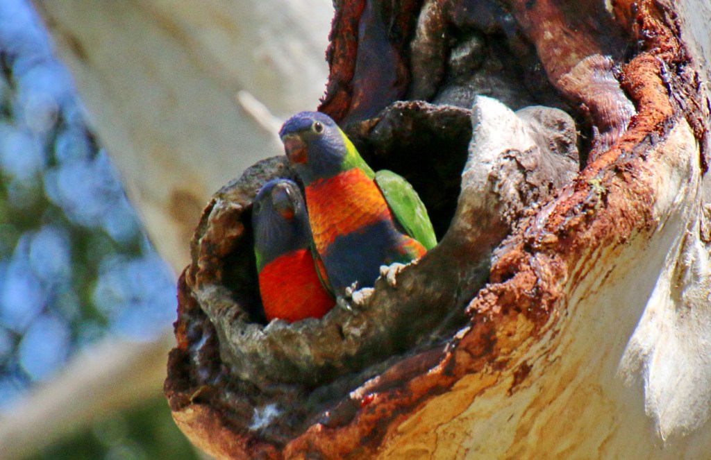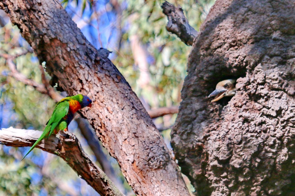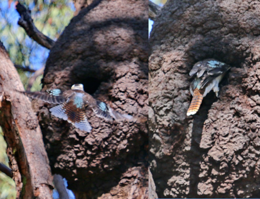 Clever birds of the Kingfisher family including the Kookaburra, Forest and Sacred Kingfisher may choose to nest in arboreal termite nests high in eucalypt trees. They initially charge at the nest and create a hole only large enough for the bird to push through. In the nest they will have their young. This is a common practise with these birds. Note the special photo below where an angry aggressive Rainbow Lorikeet is attempting to compete with the Kookaburra, which has already taken occupancy, for the same arboreal termite nest. Everyone is looking for breeding nests in forests where more trees are being felled and less breeding holes remain to go around.