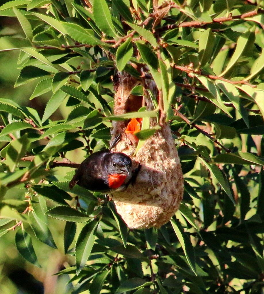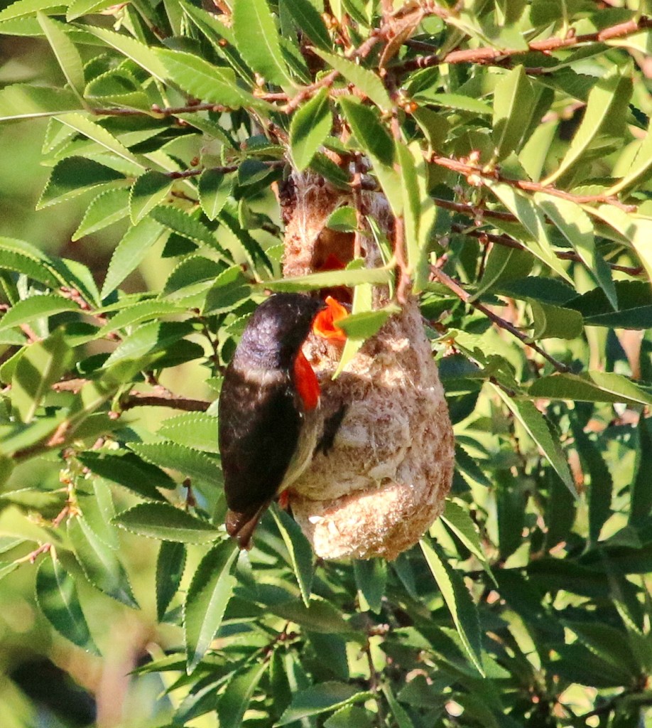 Pocket nests are similar nests for very small birds, which are difficult for larger predator birds to access, having a tiny opening at the top. The Mistletoebird and Striped Honeyeater are good examples. You can see the red open mouths of the chicks in the nest.