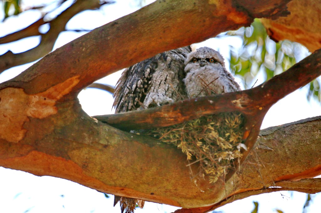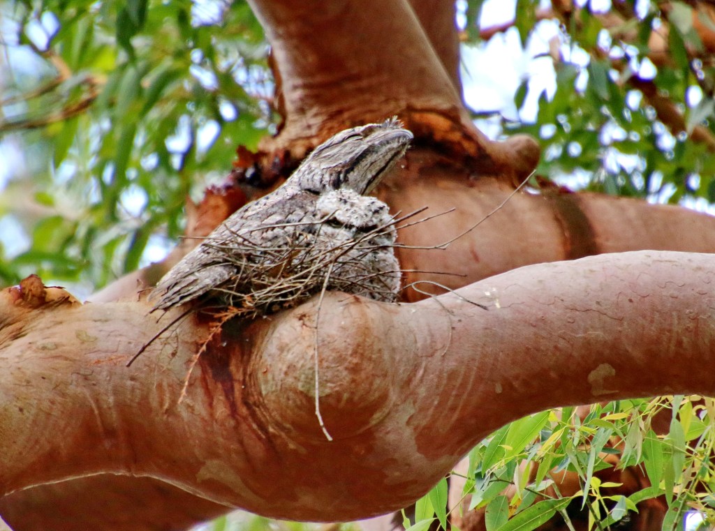 Some birds are very poor nesters and often their babies may fall from the tree to the ground requiring human intervention to replace them to the nest. The Tawny Frogmouth is a good example having a very simple nest on a few sticks balanced in a tree fork, or even worse just balanced on the branch of an angophora tree