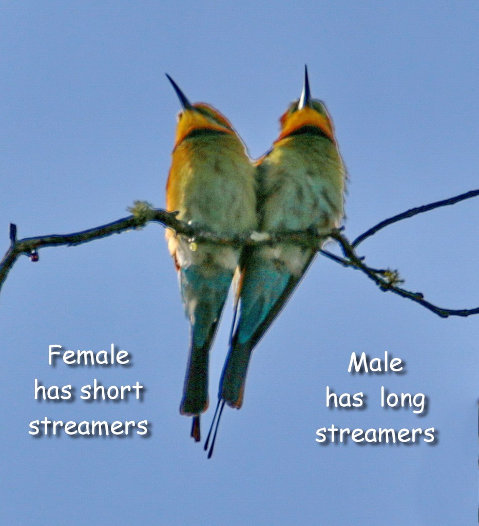 The sex can easily be discerned by the length of the streamer, which is the projection from their tail. The female has the very short thick streamers (one or two) and the male has the longer thinner streamers. Similar to the Red-tailed Tropicbird which also has tail streamers and performs aerial acrobatics during courting, these birds use the streamer to assist them in fast maneuvers when catching flying insects.