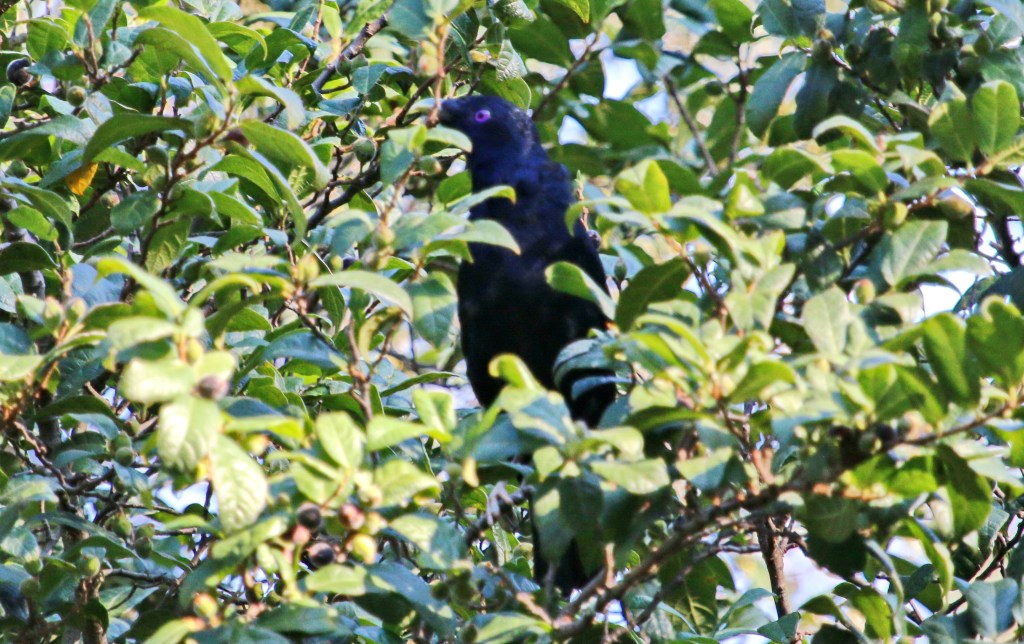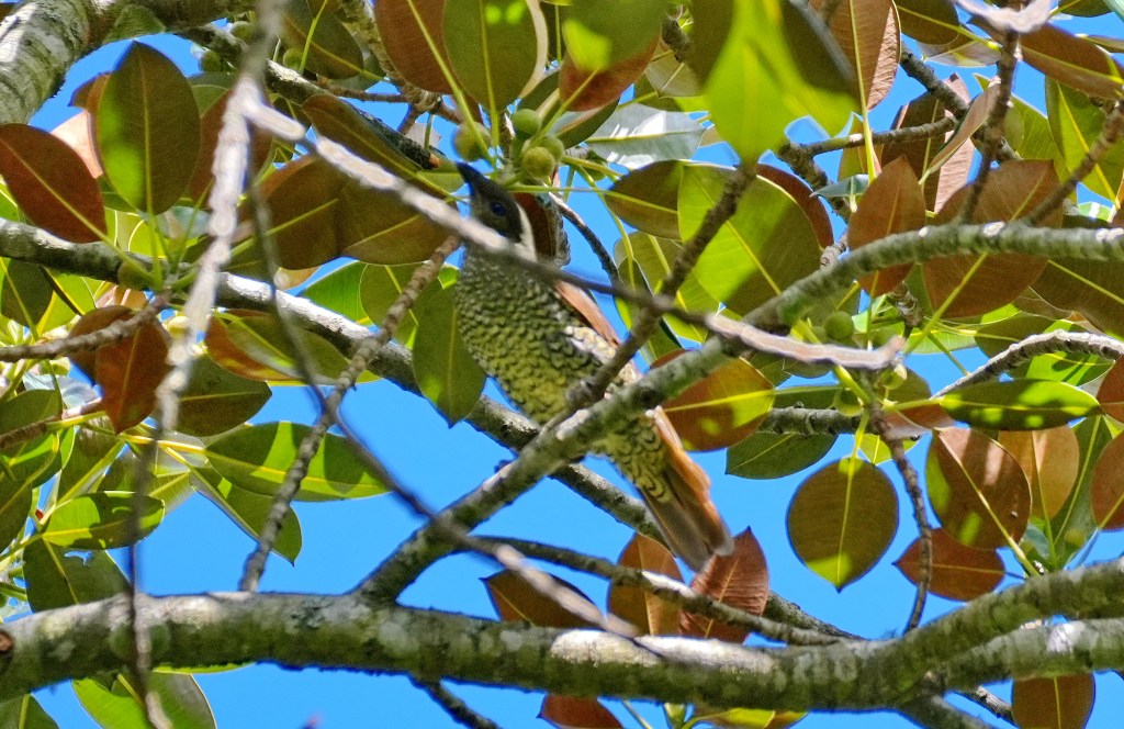 We finally received a really lovely warm Autumn afternoon for a walk, so my wife and I asked a friend of hers to join us for a bird walk down our usual National Park track. After a tasty burger lunch from our local award winning burger shop we drove to our usual parking spot and commenced our walk. We did not see the Azure Kingfisher that we saw and posted last week on the river, but we did see many Satin Bowerbirds busily feeding on the now ripe figs on the Big Fig at Big Fig Flat by the river. Figs make up their staple diet. Most of the birds were female or juvenile birds. I managed to catch an occasional glimpse as they moved through the thick foliage of the dense and dark fig tree. The extremely shy and elusive male to whom the satin name applies was difficult of all to capture. Click on images to enlarge them