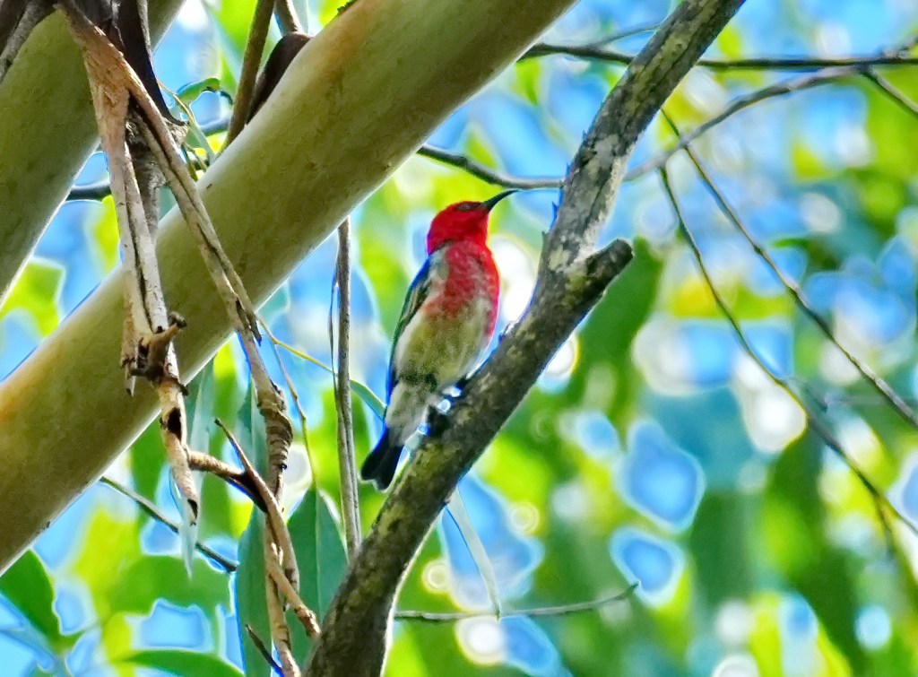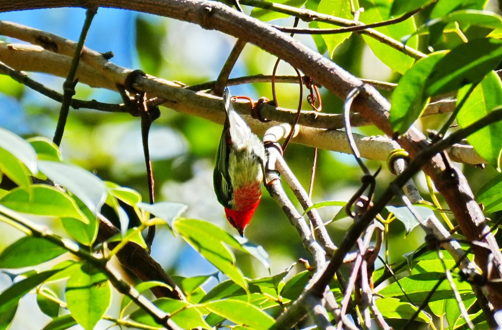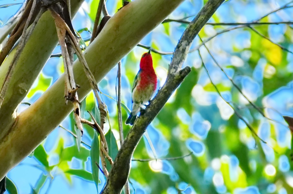 The delight of the afternoon was the seeing the other bright red bird in the park, the tiny Scarlet Honeyeater which flies above and within the canopy of the very tall eucalypt trees in small flocks constantly communicating with their very high pitched ascending calls similar to the Fantails. It is a challenge to photograph these birds flying rapidly from branch to branch high up either in the darkness of the canopy or in bright sunlight. Most images have to be adjusted for the darkness. The photos are mainly of the male which has the bright chest colouring. The female and juvenile have only a faint wash of red on their face and neck. Click on mages to enlarge them.
