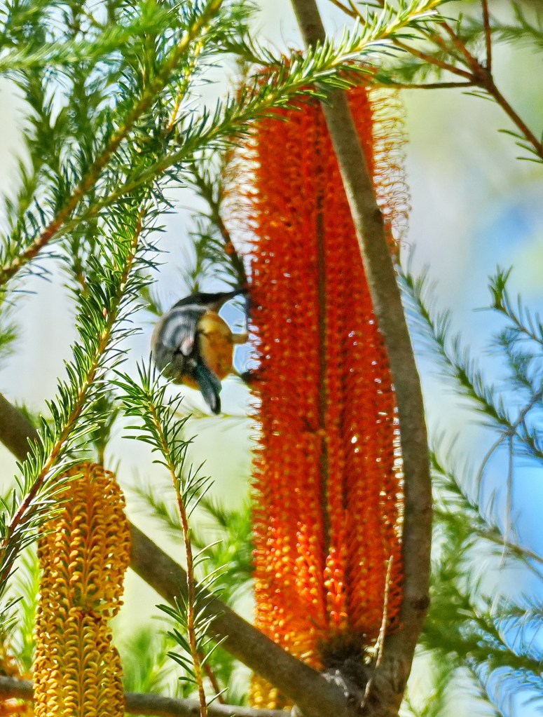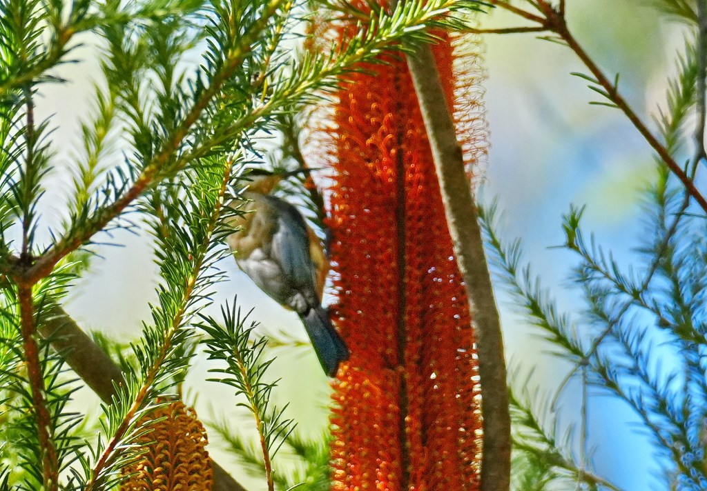 Lastly, we noted this Eastern Spinebill another honeyeater species feeding from the current Banksia spinulosa flower heads which are very high in nectar. This is one of the few nectar producing flowers at this dormant stage and resting Autumn season.
