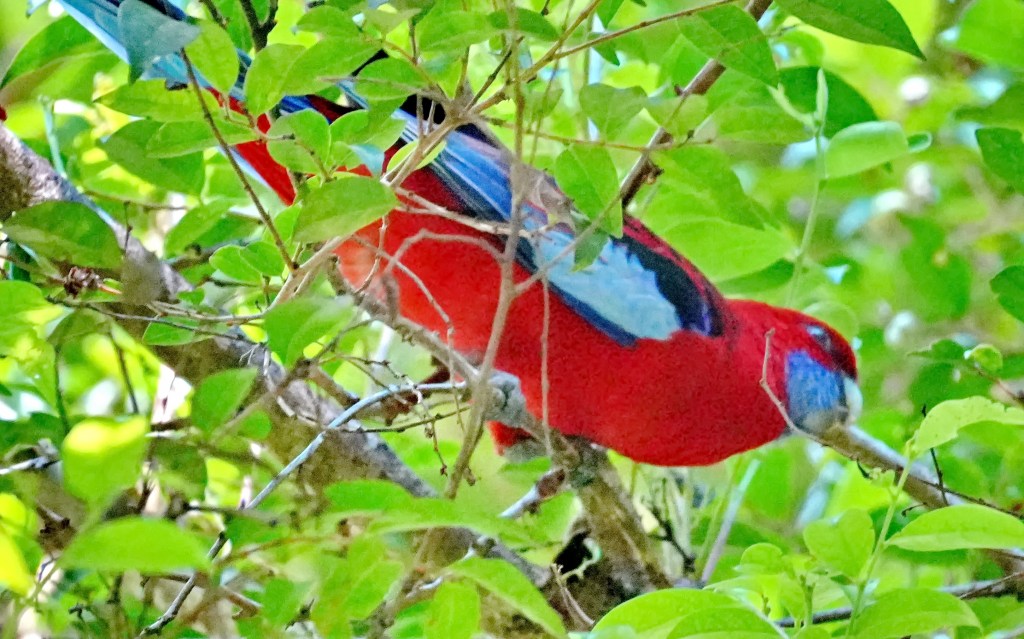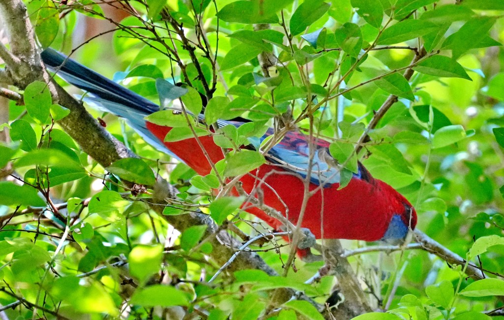 While we rested at the picnic table our friend sighted this bright Eastern Crimson Rosella quietly feeding on the seed pods in a nearby tree, trying to be inconspicuous.