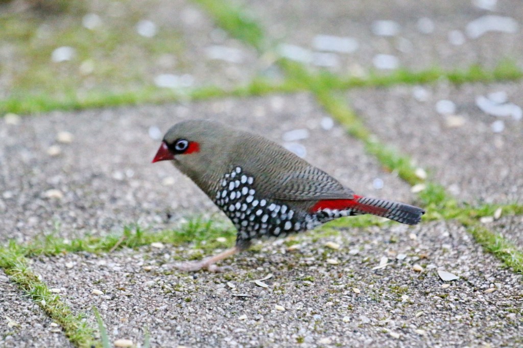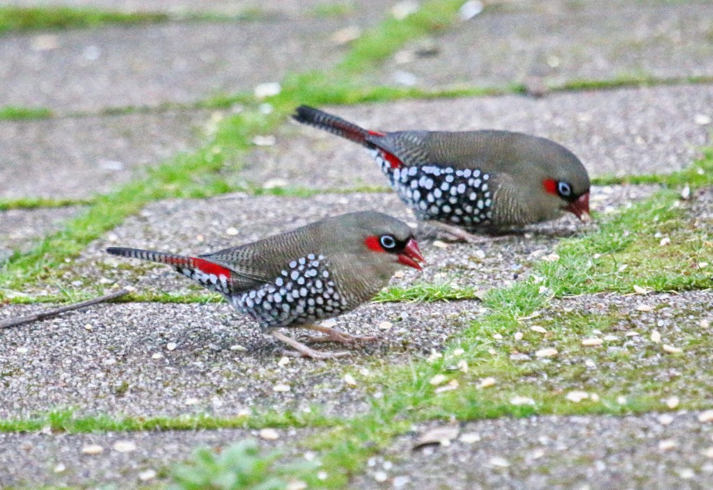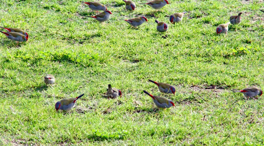 Here a small flock or family groups of Red-eared Firetails are feeding in a courtyard of a Margaret River home alongside the Western Rosella which is also endemic to this small area of south west WA.