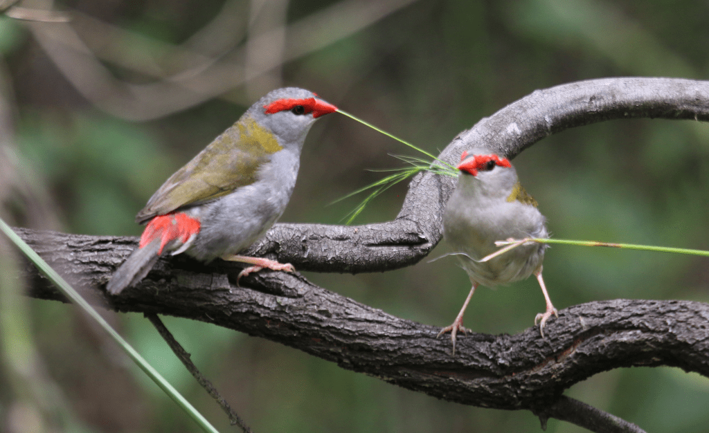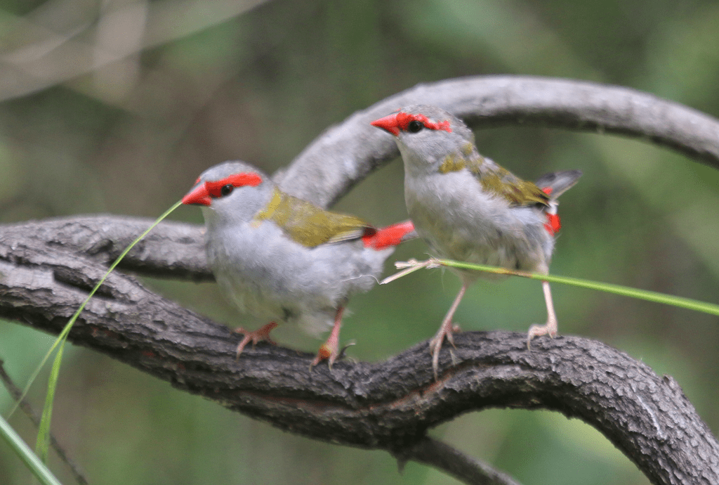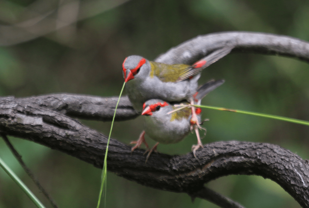 Part of the courtship display of the Red-browed Finch is to present the female with a stick of grass with seed intact and will bob about her. The male will then mount her if she permits remains and he will mate with grass in beak.